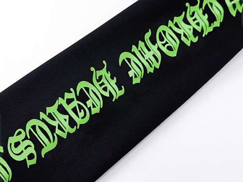 - Sleeves: Vertical neon green script running down both arms for that iconic stacked look.