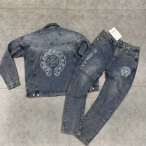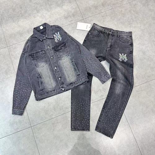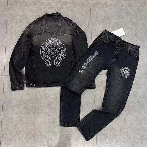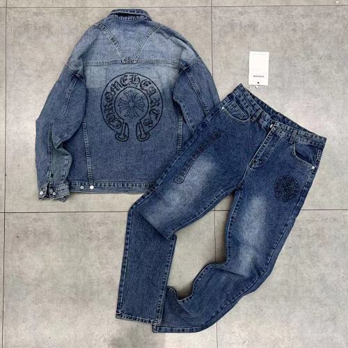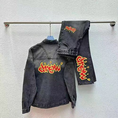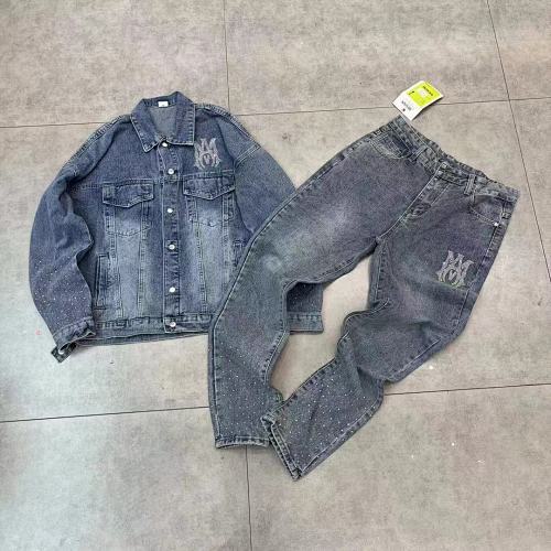 | Key Details | Trucker-style jacket with button closure, chest pockets, scattered rhinestones on sleeves, large rhinestone monogram logo on the chest | Straight-leg jeans with five-pocket design, button & zip fly, scattered rhinestones on the hems, matching rhinestone monogram logo on the thigh |