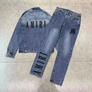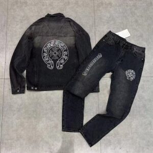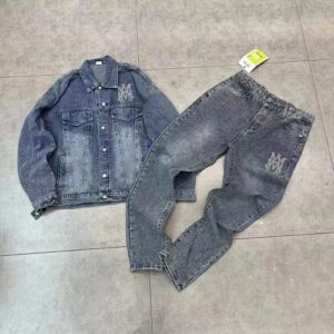 - Sparkling Rhinestone Details: A monogram logo adorns the chest of the jacket and thigh of the jeans, while scattered crystals add subtle shine to the sleeves and hems.