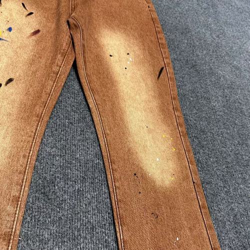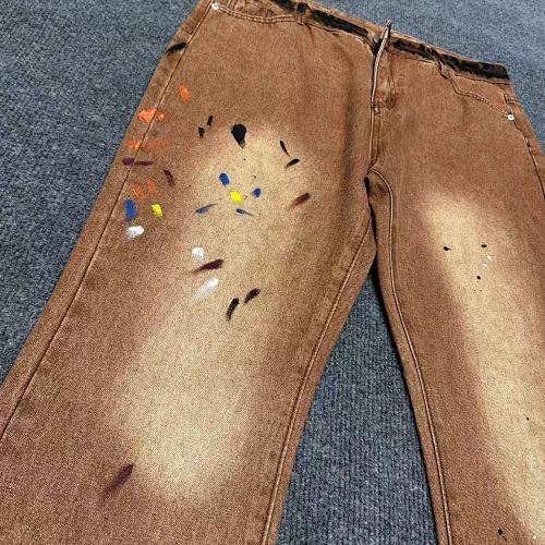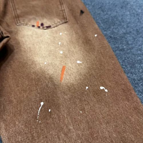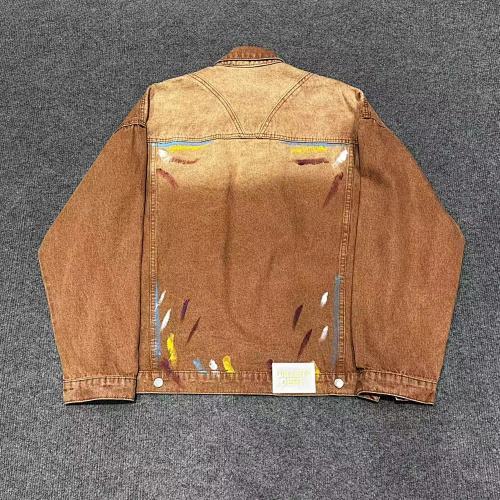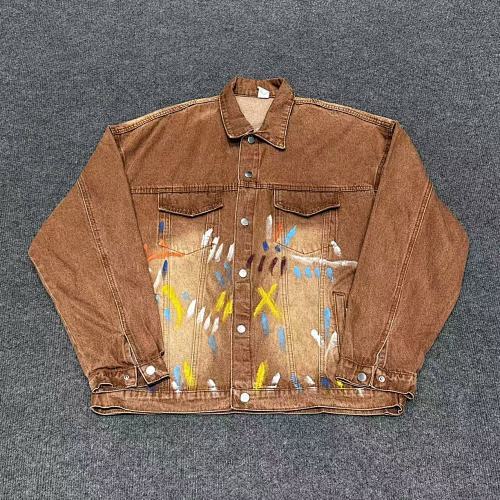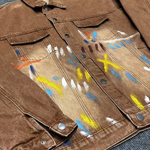 | Key Details | Trucker-style design, button closure, two chest pockets, hand-painted splatters, vintage brown wash, ribbed cuffs | Straight leg, button & zip fly, five-pocket design, subtle paint splatters, vintage brown wash, slight fading |